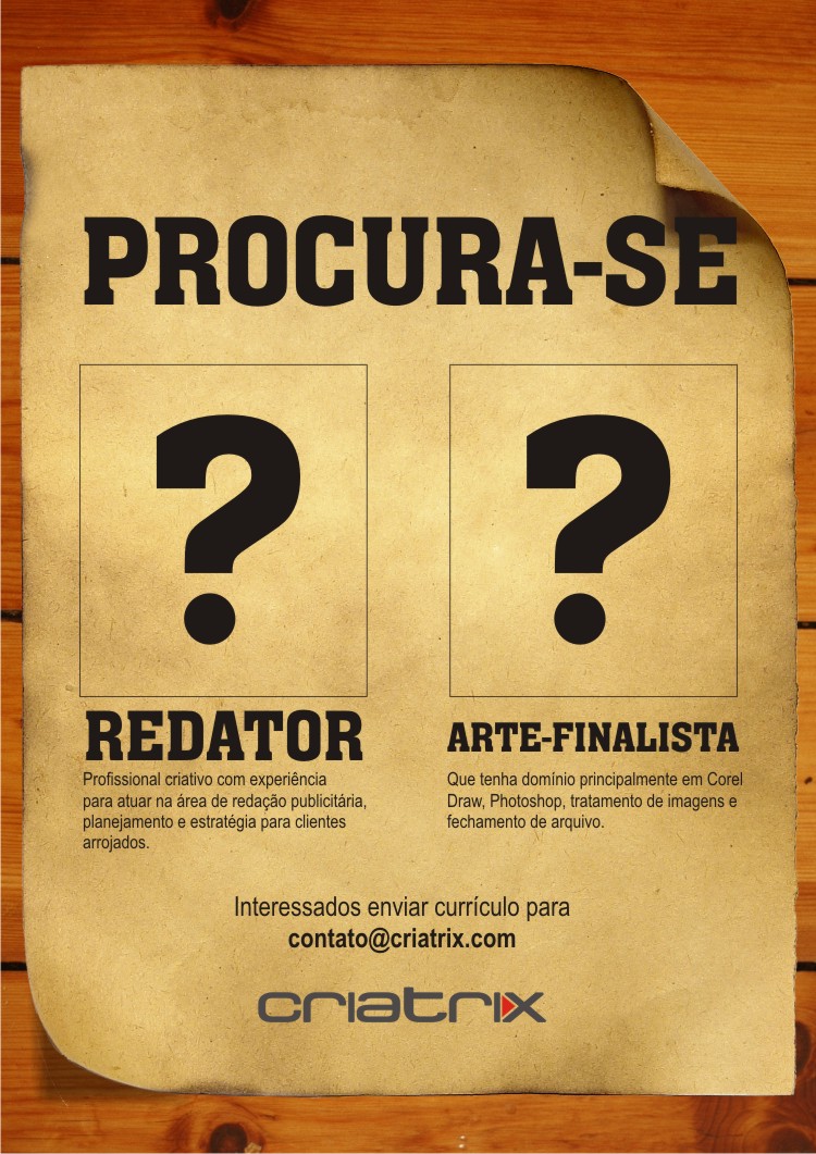 Os interessados devem enviar currículo e portfólio para euna@criatrix.com/blog e depois o processo de seleção será conduzido pela equipe de criação, justamente as pessoas com quem esses novos profissionais irão trabalhar.